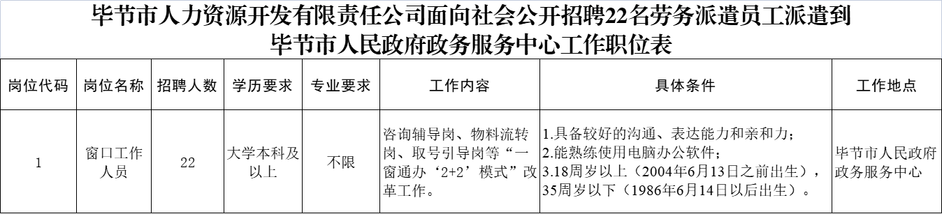 本次计划招聘劳务派遣员工22名,具体岗位要求详见《毕节市人力资源开发有限责任公司面向社会公开招聘22名劳务派遣员工派遣到毕节市人民政府政务服务中心工作职位表》(见附件1)。