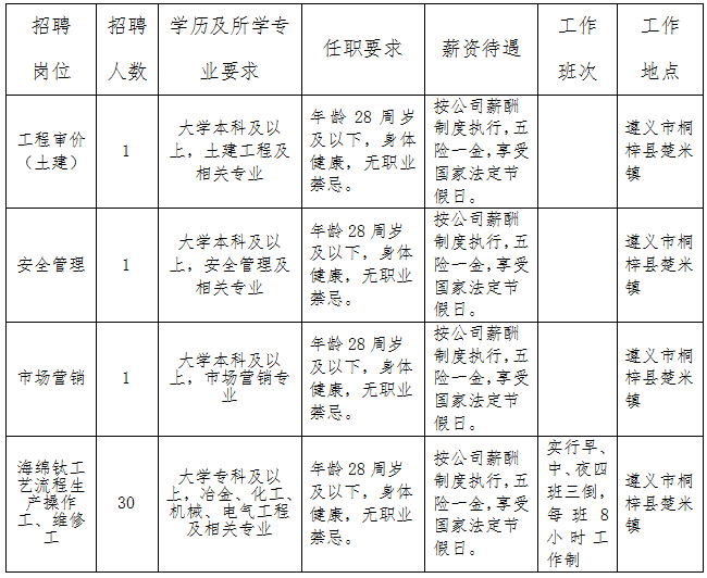 贵州遵钛(集团)有限责任公司,是国有大型稀有金属钛冶炼企业,主导产品“航天”牌海绵钛长期作为国内航天航空主要基础材料。现因公司发展需要,面向社会公开招聘33人,具体招聘事宜公告如下: