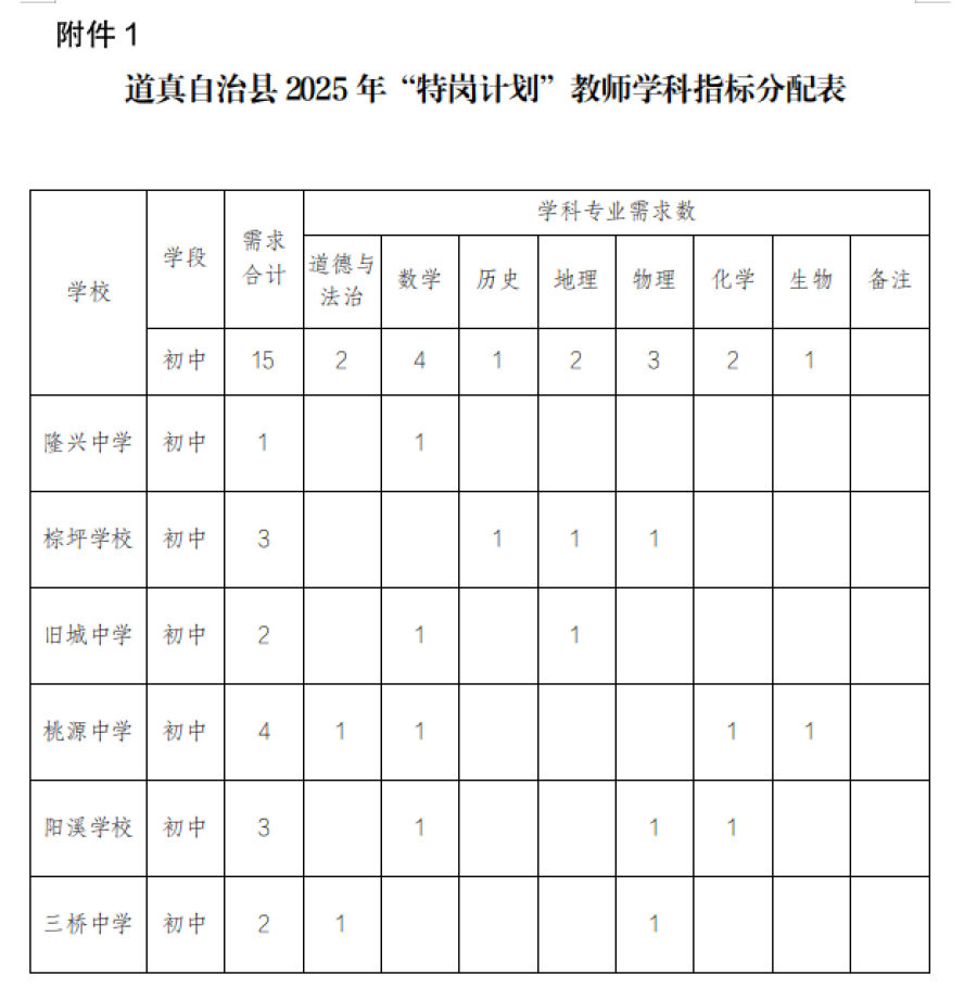 2025年中央“特岗计划”教师招聘15名,用于农村初中教师。具体招聘计划分配详见《道真自治县2025年特岗计划教师招聘学科指标分配表》(附件1)。