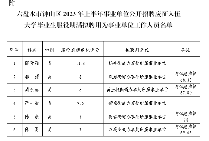根据《六盘水市大学毕业生参军入伍激励办法(试行)》和《六盘水市2023年上半年事业单位及国有企业公开招聘应征入伍大学毕业生简章》的规定,经征兵报名、事业单位报名、笔试、面试、体格检查、政治考核、签订协议、定兵服役、量化评分、退役选岗(其中量化评分相同的以考试总成绩从高至低排序选岗)、单位考察等工作程序,并报钟山区人民政府常务会议研究决定同意聘用。现将六盘水市钟山区2023年上半年事业单位公开招聘应征入伍大学毕业生服役期满拟聘用为事业单位工作人员名单予以公示(名单附后),经公示无异议后按规定进行聘用备案。