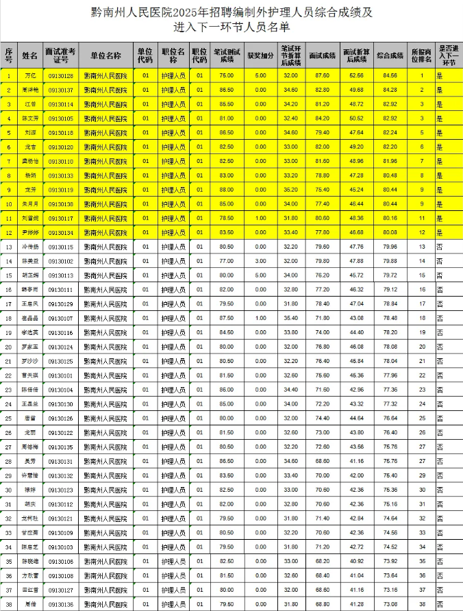 附件:《黔南州人民医院2025年招聘编制外护理人员综合成绩及进入下一环节人员名单》