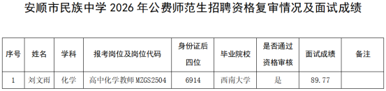 根据《安顺市民族中学2026年公开招聘公费师范生公告》,现将参加安顺市民族中学2026年公开招聘公费师范生面试人员现场资格审核情况及面试成绩予以公示。