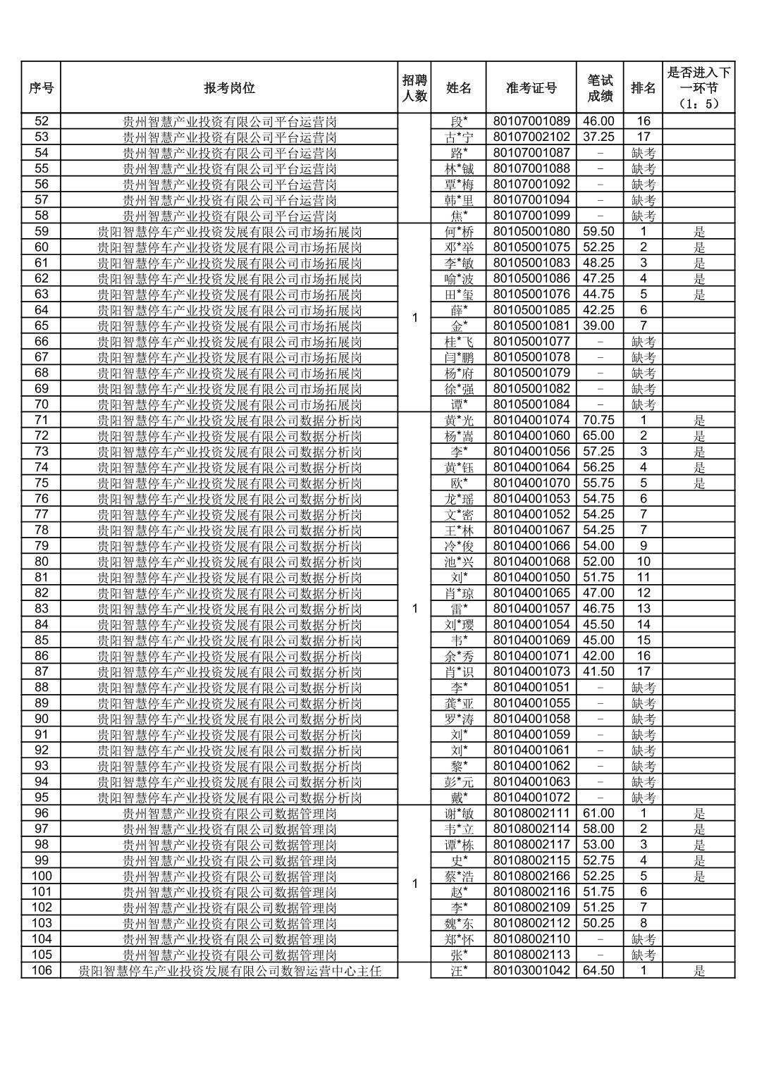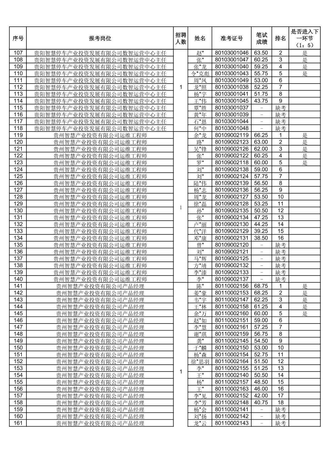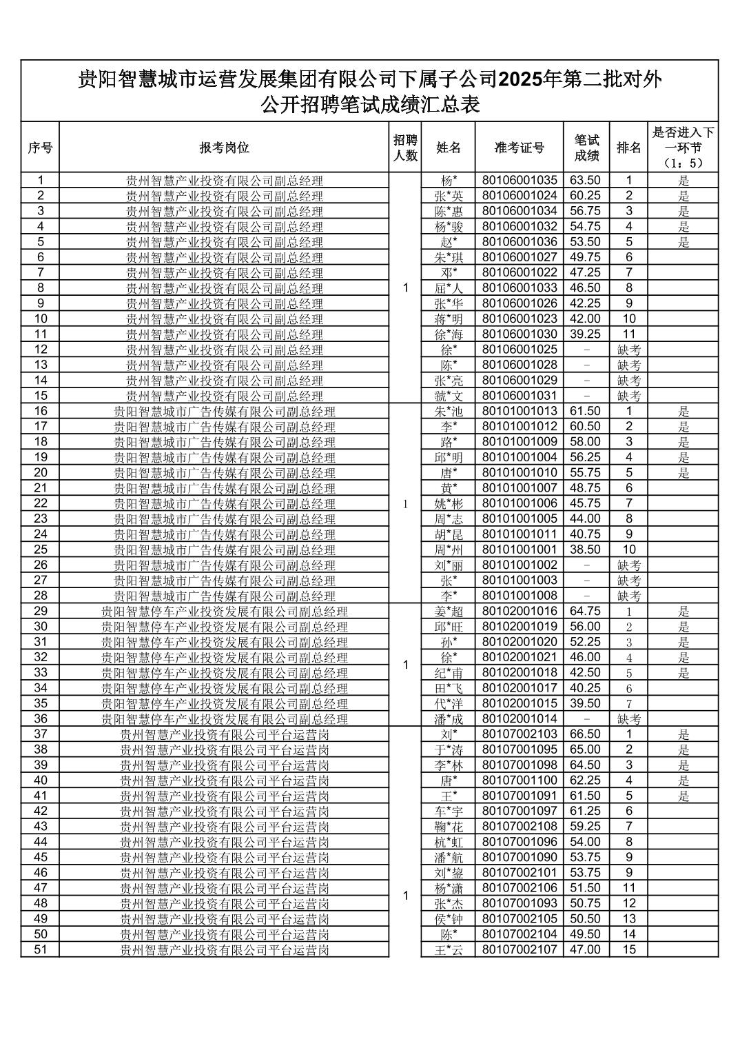 根据贵阳智慧城市运营发展集团有限公司下属子公司2025年第二批对外公开招聘有关工作安排,现将笔试成绩公示如下。
