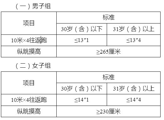备注:10米×4往返跑每人最多可测2次,1次测评达标即视为该项目测评合格;纵跳摸高每人最多可测3次,1次测试达标即视为该项目测试合格。