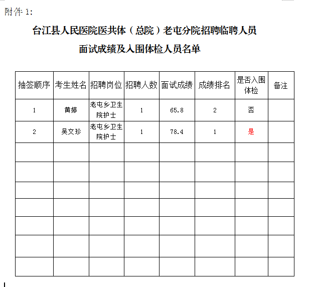 台江县人民医院(医共体)老屯分院2026年招聘临聘人员面试工作已结束,现将面试成绩及入围体检人员公布如下: