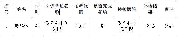 因石阡县中医医院岗位(岗位代码SQ16),总成绩排名第一的考生陈兰明自愿放弃体检,根据《铜仁市2025年“千名英才·智汇铜仁”本地引才公告》规定,按考试总成绩从高到低依次递补,现将递补人员体检结果公示如下: