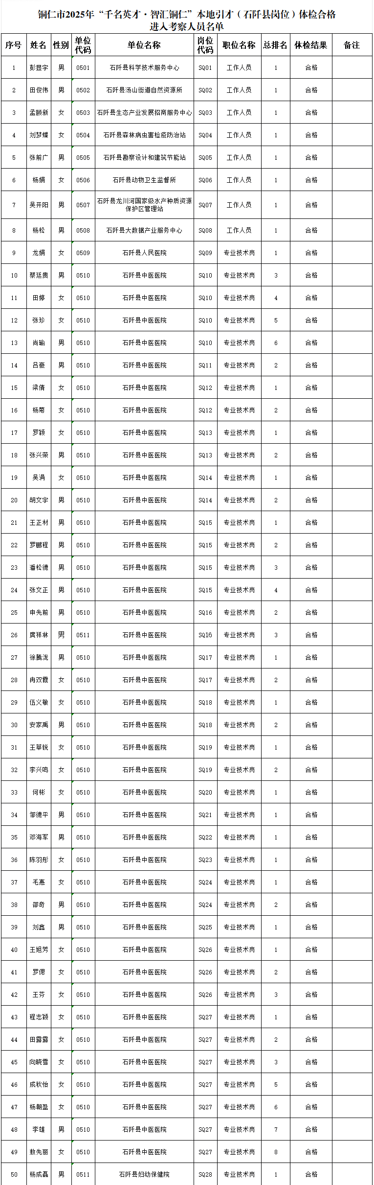 附件:铜仁市2025年“千名英才·智汇铜仁”本地引才(石阡县岗位)体检合格进入考察人员名单
