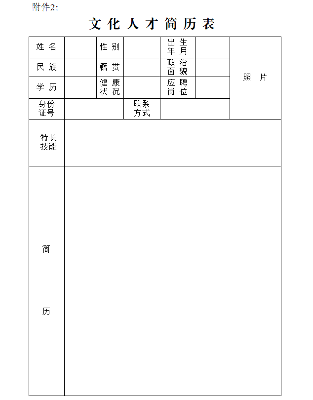 (1)《文化人才简历表》(详见附件2,请自行下载,A4纸正反面打印);