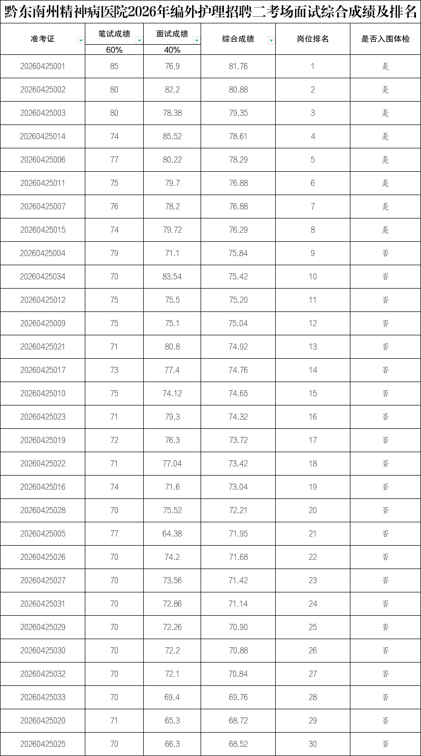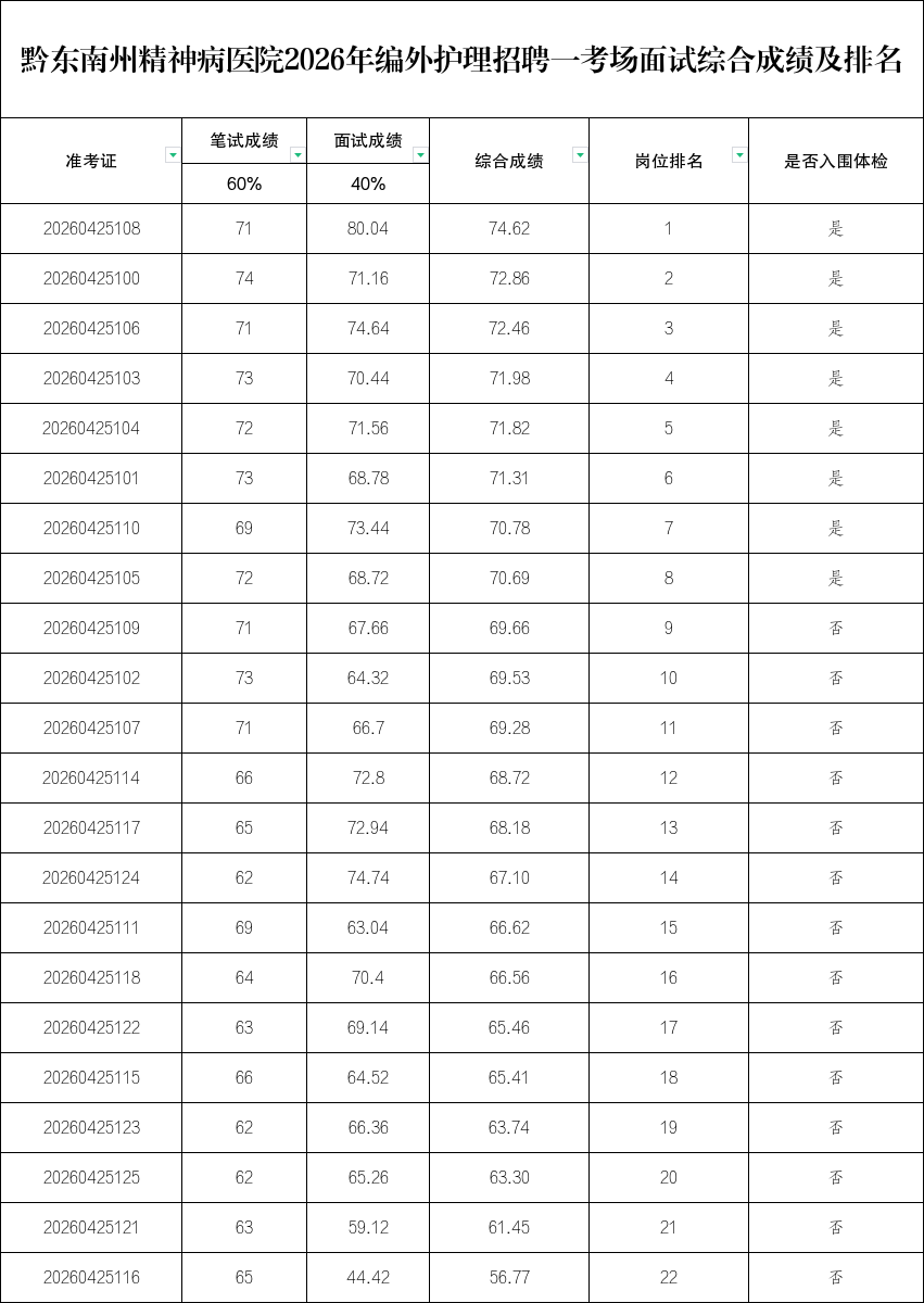 排名根据《黔东南州精神病医院2026年编外医护人员招聘方案》规定,我院2026年公开招聘编外护理人员笔试、面试工作已全部结束,现将考生综合成绩及进入体检环节人员名单予以公布(详见附件)。